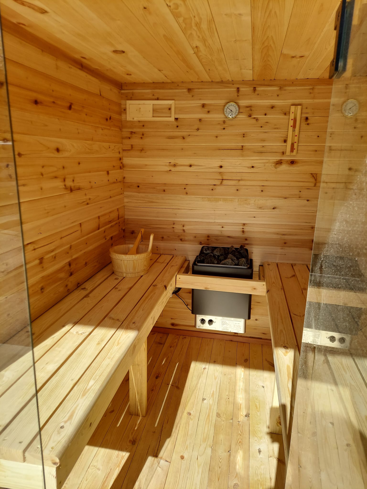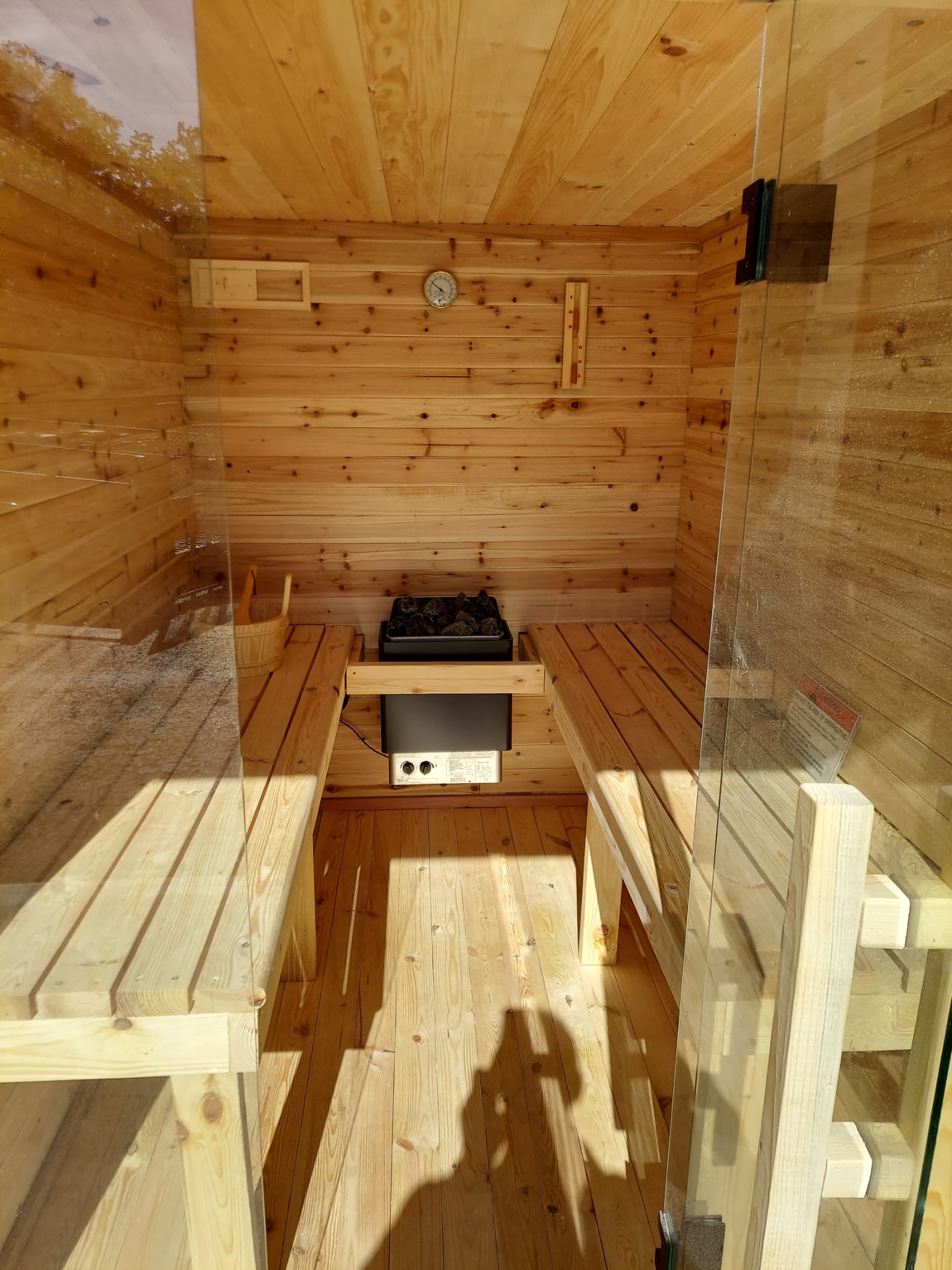 Comfortably designed to seat up to four adults, this sauna offers a spacious and relaxing experience with stunning panoramic views.